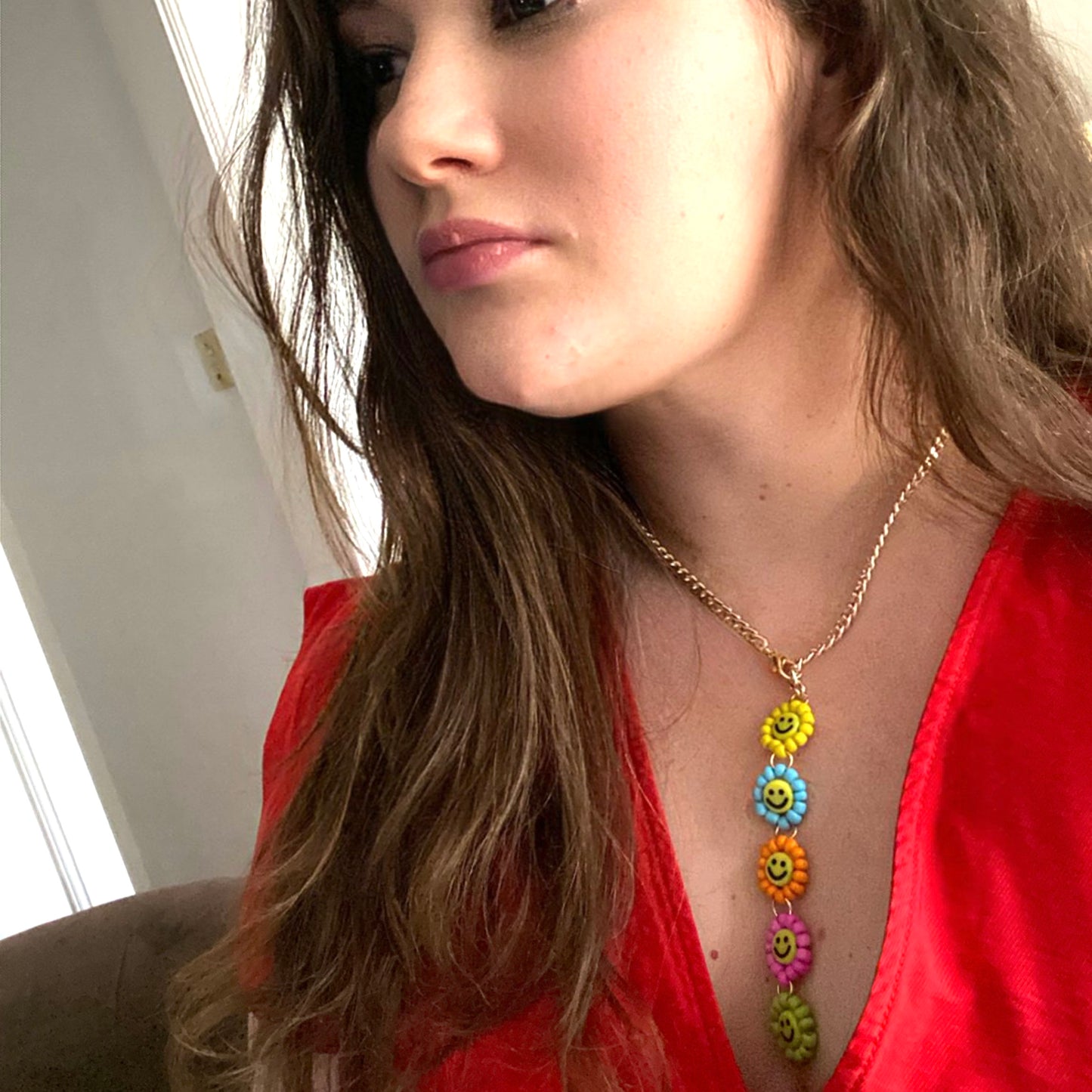 Flores felices!!!! Y super coloridas es lo que necesitas para lucir esta temporada! Este collar lo tiene toooodooo smileys, flores y colores, necesitas algo más? 🙌🏻🙌🏻💜🌈 esta hecho de chaquirón, la cadena mide 45 cm y el largo de las flores juntas es de 10cm aprox. La cadena es de aluminio de alta calidad.